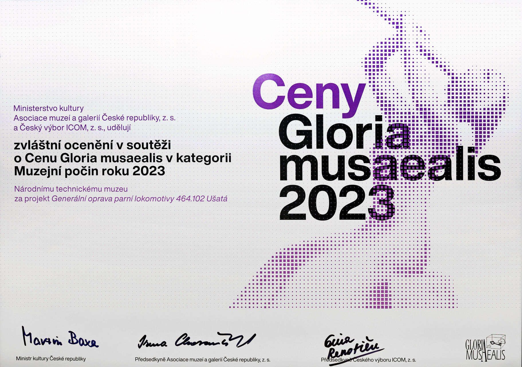 Národní technické muzeum získalo zvláštní ocenění v soutěži Gloria musaealis v kategorii Muzejní počin roku za projekt generální opravy parní lokomotivy 464.102 „Ušatá“.